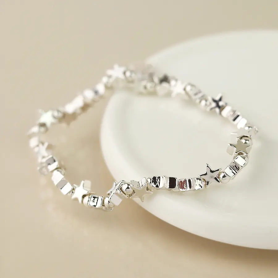 Silver plated stretch bracelet with alternate polished stars and round beads.